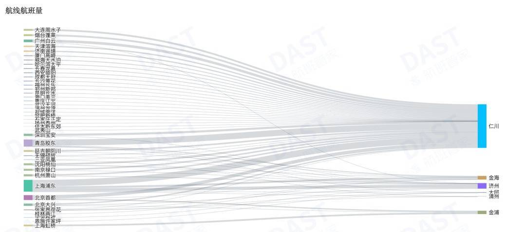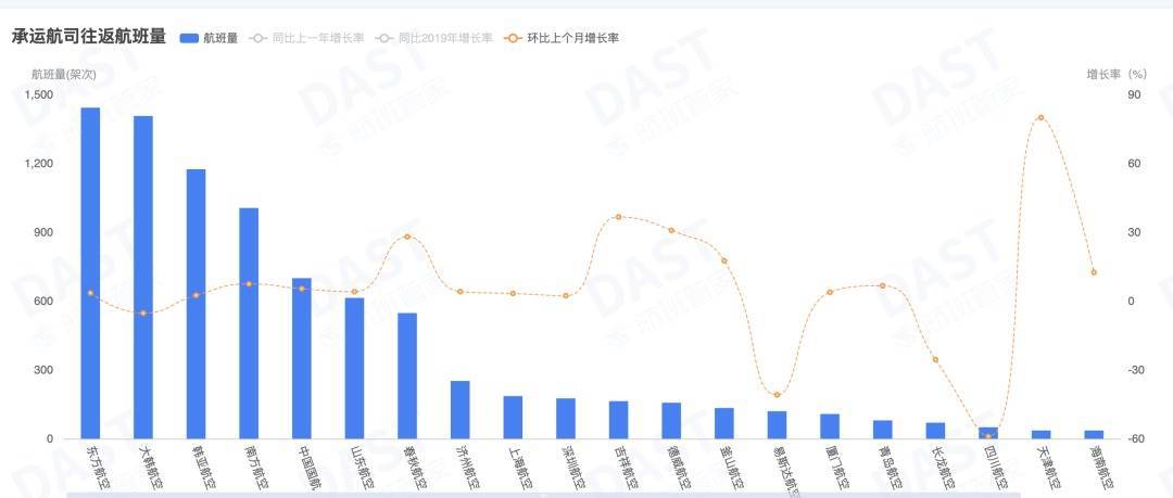 中韩航线上,东方航空承运航班量位居首位,大韩航空紧随其后。环比数据显示,在参与该航线运营的22家航司中,天津航空、吉祥航空、德威航空的航班量环比增幅显著,分别达80%、36.7%、30.8%。