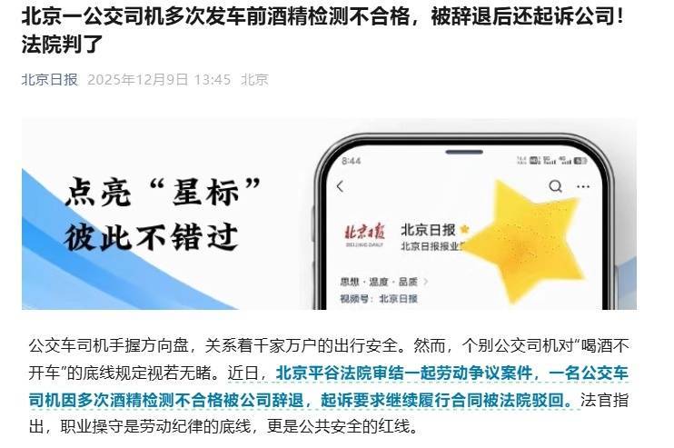 北京一公交司机多次发车前酒精检测不合格南方配资平台,被辞退后起诉公司,要求继续履行合同。近日,北京平谷法院审结一起劳动争议案件,法院驳回当事司机的诉求。法官指出,职业操守是劳动纪律的底线,更是公共安全的红线。